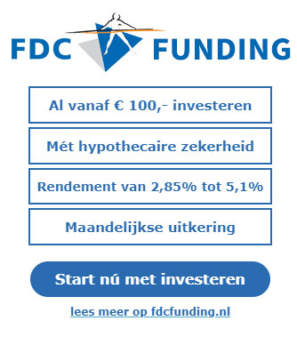 FDC FUNDING biedt ‘investeren met zekerheid‘. U kunt particulier of zakelijk investeren in verhuurhypotheken en zakelijke hypotheken. Al vanaf 100 euro is investeren mogelijk en de rentes zijn veel hoger dan bij de bank (van 2,85% tot 5,1 % per project).